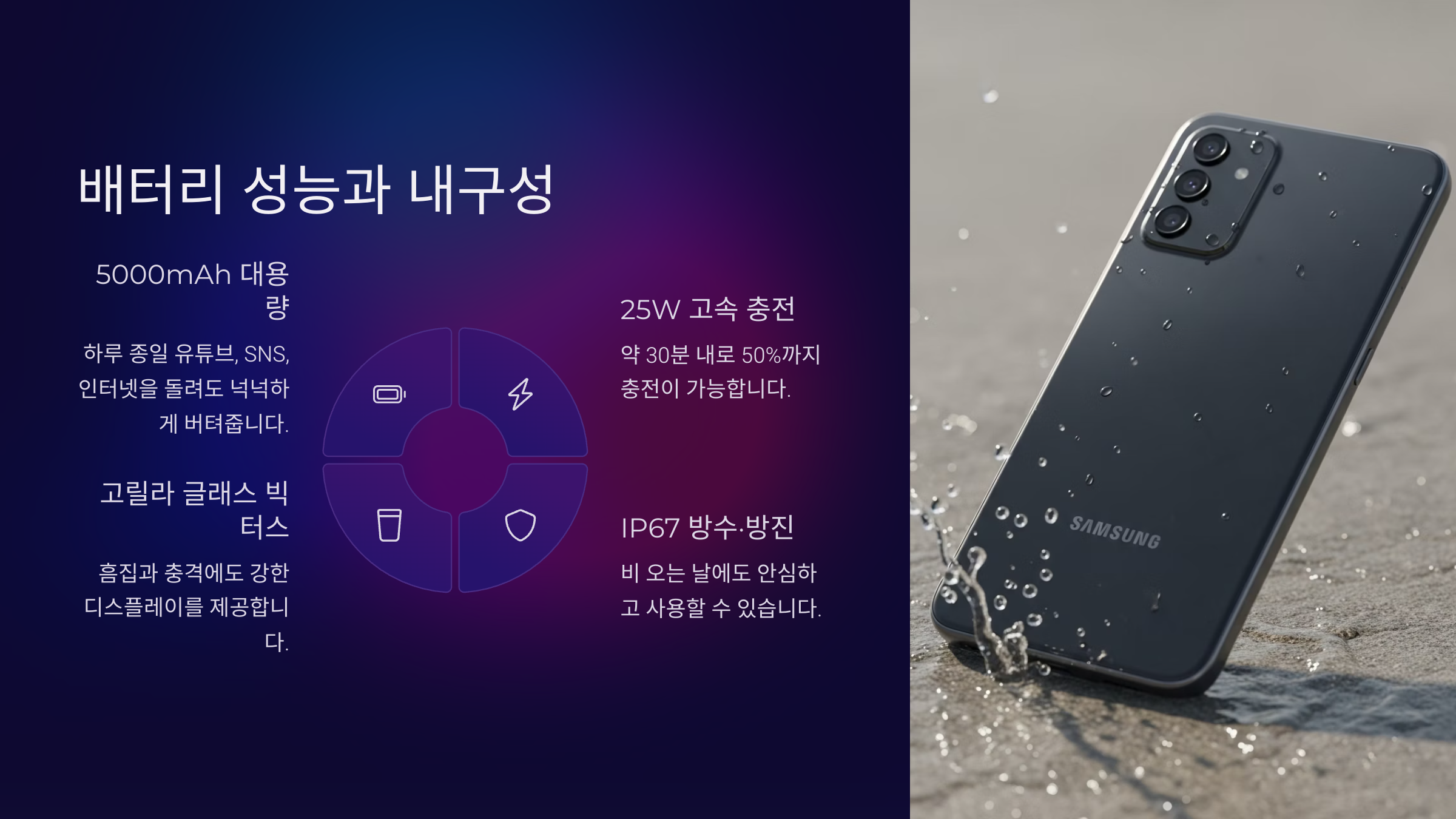 또한 갤럭시 A36은 IP67 등급의 방수·방진 기능을 갖추고 있어서 비 오는 날에도 안심하고 사용할 수 있어요. 먼지 유입도 차단돼서 야외 활동이나 작업 현장에서도 유용해요. 디스플레이는 코닝 고릴라 글래스 빅터스 적용으로 흠집과 충격에도 어느 정도 강해요.
